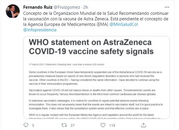Entretanto, la OMS afirmó que, “en este momento considera que los beneficios de la vacuna AstraZeneca superan sus riesgos y recomienda que continúen las vacunaciones”. Y el ministro de Salud de Colombia, Fernando Ruiz lo compartió en su cuenta en Twitter.