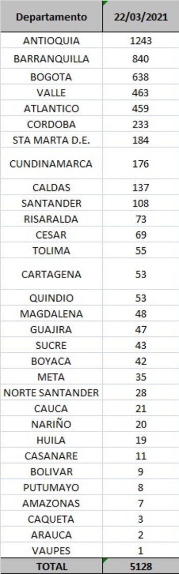 El Ministerio de Salud y Protección Social reportó, este lunes 22 de marzo, 5.128 casos nuevos de covid-19 en Colombia. En las últimas 24 horas se procesaron 28.160 pruebas de las cuales 21.449 son PCR y 6.711 de antígenos.
