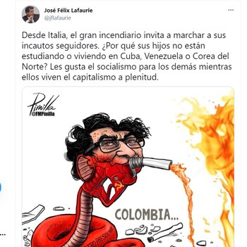 También hubo críticas por el lado del presidente de Fedegan, José Félix Lafaurie: “Desde Italia, el gran incendiario invita a marchar a sus incautos seguidores. ¿Por qué sus hijos no están estudiando o viviendo en Cuba, Venezuela o Corea del Norte? Les gusta el socialismo para los demás mientras ellos viven el capitalismo a plenitud”.