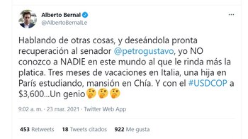 Por su parte, el economista Alberto Bernal, muy cercano al uribismo, señaló: “Hablando de otras cosas, y deseándole pronta recuperación al senador Gustavo Petro, yo no conozco a nadie en este mundo al que le rinda más la platica. Tres meses de vacaciones en Italia, una hija en París estudiando, mansión en Chía. Y con el #USDCOP a $3,600... Un genio”.