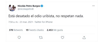 Por estos cuestionamiento, Nicolás Petro aseguró en su cuenta: “Está desatado el odio uribista, no respetan nada”.