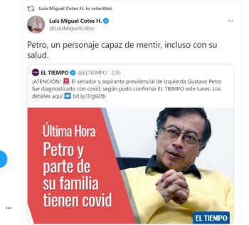 Incluso, hay trinos de políticos que afirman que el candidato presidencial se inventó estar enfermo. “Petro, un personaje capaz de mentir, incluso con su salud”, escribió el exgobernador de Magdalena Luis Miguel Cotes.