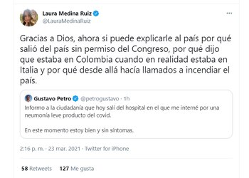 Sobre su viaje a Italia, la politóloga uribista Laura Medina Ruiz, comentó: “Gracias a Dios, ahora si puede explicarle al país por qué salió del país sin permiso del Congreso, por qué dijo que estaba en Colombia cuando en realidad estaba en Italia y por qué desde allá hacía llamados a incendiar el país”.