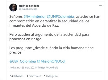 A través de su cuenta de Twitter, el exjefe guerrillero denunció que la UNP “ha vuelto a vulnerar el derecho fundamental de proteger la vida a un miembro de la dirección del Partido Comunes. Esta vez la persona puesta en riesgo es Huber Ballesteros bajo el absurdo argumento de la austeridad”.