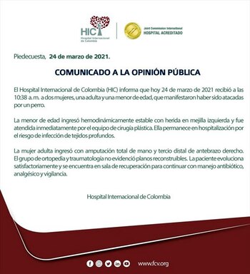 A tráves de un comunicado, el hospital señaló a la opinión pública que, “la menor de edad ingreso hemodinámicamente estable con herida en la mejilla izquierda y fue atendida inmediatamente por el equipo de cirugía plástica ella permanece en hospitalización por el riesgo de infección de tejidos profundo”.