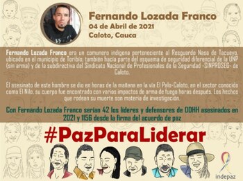 De acuerdo con Indepaz, en lo que va de 2021 habrían sido asesinados 42 líderes y defensores de derechos humanos 1.156 desde la firma del Acuerdo Final de Paz.
