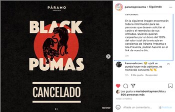 La agrupación norteamericana Black Pumas no se presentará definitivamente en Bogotá. El show que fue postergado dos veces, y programado para el día 10 de enero del 2021 en el Teatro Royal Center, no pudo ser aplazado hasta que la emergencia sanitaria por el covid-19 se supere.
