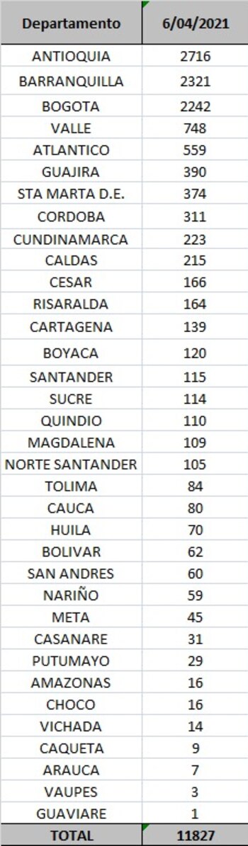 El Ministerio de Salud y Protección Social reportó, este martes 6 de abril, 11.827 casos nuevos de covid-19 en Colombia. En las últimas 24 horas se procesaron 44.246 pruebas de las cuales 20.755 son PCR y 23.491 de antígenos.