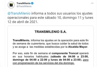 Tras la cuarentena estricta que regirá en Bogotá entre las 00:00 del sábado 10 de abril y las 4 a. m. del martes 13 de abril, debido al tercer pico de covid-19 en Colombia, TransMilenio dio a conocer como será la prestación del servicio los días de la restricción.