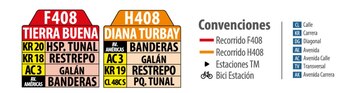 De acuerdo con TransMilenio, los usuarios la podrán identificar fácilmente la ruta así: cuando su código sea F408 y el color del rutero sea rojo, se dirigirá hacia Tierra Buena. En este caso, transitará por la carrera 20 pasando por el Hospital Tunal, la Carrera 18 pasando por Restrepo, la avenida calle 3 pasando por el barrio Galán y transitará también por la avenida Américas (pasando por Banderas).