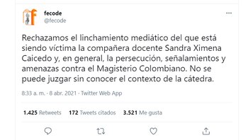“Rechazamos el linchamiento mediático del que está siendo víctima la compañera docente Sandra Ximena Caicedo y, en general, la persecución, señalamientos y amenazas contra el Magisterio Colombiano. No se puede juzgar sin conocer el contexto de la cátedra”, señaló la organización académica.