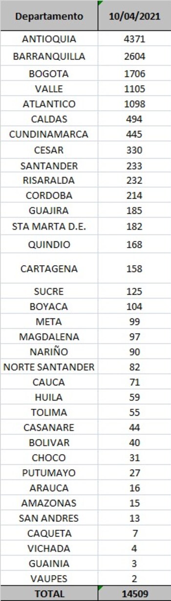 El Ministerio de Salud y Protección Social reportó, este sábado 10 de abril, 14.509 casos nuevos de covid-19 en Colombia. En las últimas 24 horas se procesaron 71.613 pruebas de las cuales 38.490 son PCR y 33.123 de antígenos.
