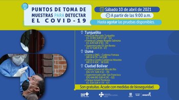 Asimismo detalló que son, “más de 170 puntos de toma gratuita de pruebas COVID están habilitados por la Secretaría de Salud y las EPS para que los bogotanos que deseen practicársela, se acerquen desde este sábado 10 y hasta el próximo lunes 12 de abril.”