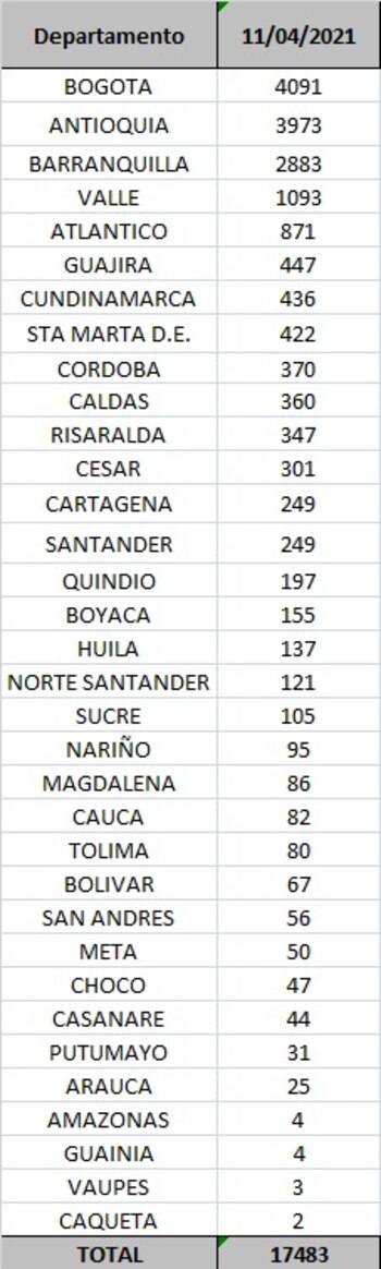 El Ministerio de Salud y Protección Social reportó, este domingo 11 de abril, 17.483 casos nuevos de covid-19 en Colombia. En las últimas 24 horas se procesaron 68.067 pruebas de las cuales 45.961 son PCR y 22.106 de antígenos.