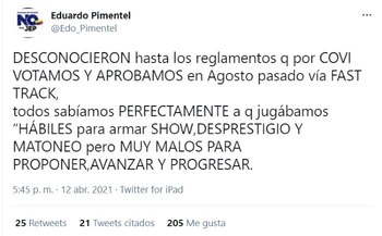 “DESCONOCIERON hasta los reglamentos que por COVID VOTAMOS Y APROBAMOS en agosto pasado vía FAST TRACK, todos sabíamos PERFECTAMENTE a qué jugábamos. HÁBILES para armar SHOW, DESPRESTIGIO Y MATONEO pero MUY MALOS PARA PROPONER, AVANZAR Y PROGRESAR”, agregó después Pimentel en la misma red social.