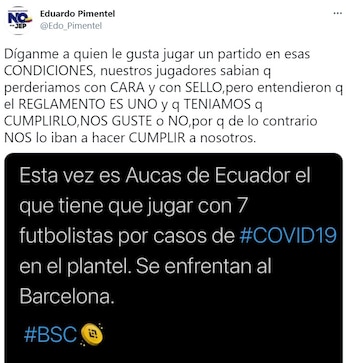 Después de los ataques a Águilas Doradas, Pimentel aseguró que jugaron el partido y acataron la decisión sin chistar porque lo establecía el reglamento. Incluso, en otros trinos en Twitter citó el caso de Aucas de Ecuador, un equipo que tuvo que vivir la misma situación.