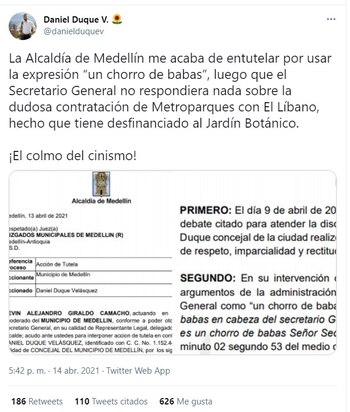 “La Alcaldía de Medellín me acaba de entutelar por usar la expresión “un chorro de babas”, luego que el Secretario General no respondiera nada sobre la dudosa contratación de Metroparques con El Líbano, hecho que tiene desfinanciado al Jardín Botánico”, señaló a través de Twitter el concejal Duque.