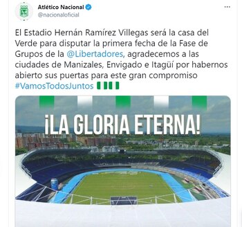 “Atlético Nacional solicitó a la Secretaría del Deporte de Manizales el préstamo del estadio Palogrande para jugar sus partidos de fase de grupos de Copa Libertadores. Esta petición fue aprobada y representará recursos para el mantenimiento del escenario deportivo”, fueron las palabras de la alcaldía de la capital de Caldas.