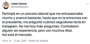 Según contó Salazar en su cuenta de Twitter, ella avanzó en el proceso de selección hasta un punto en el que tuvo una entrevista con el presidente de la compañía, quien, extrañamente, le preguntó por la cantidad de seguidores que tenía en Instagram. Tras ello, cuenta la periodista, el dirigente no le hizo más preguntas y terminaron contratando a otra persona con menos experiencia.