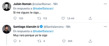 Además, en el hilo del tweet también se pronunciaron los actores colombianos Julián Román y Santiago Alarcón, quienes, con un tono sarcástico, criticaron esta medida. Por un lado, Román dijo “si me sigues te sigo”; entretanto, Alarcón afirmó: “Muy raro porque yo te sigo”.