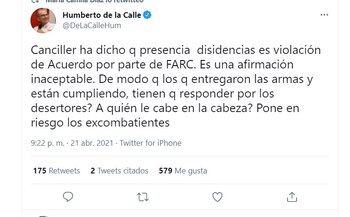 Esta frase polémica de la canciller ya fue contestada por Humberto de la Calle, uno de los negociadores del Acuerdo Final de Paz. “Canciller ha dicho que presencia disidencias es violación de Acuerdo por parte de Farc. Es una afirmación inaceptable. De modo que los que entregaron las armas y están cumpliendo, tienen que responder por los desertores. A quién le cabe en la cabeza? Pone en riesgo los excombatientes”, dijo.