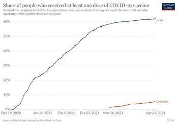 Claro, comparar la situación es complejo, puesto que Israel no alcanza a tener 10 millones de habitantes en su territorio, mientras que en Colombia ya superamos los 50. Según los últimos datos de Our World in Data, actualizados al 18 de abril, el 61,83% de la población en Israel ya fue inoculada con la primera de las dosis de la vacuna Pfizer- BioNTech y el 57,51% ya recibió ambas aplicaciones.