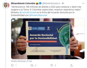 Este martes la entidad dio a conocer que Carlos Eduardo Correa, ministro de Ambiente, y Jaime Cabal Sanclemente, presidente de la Federación Nacional de Comerciantes (Fenalco), firmaron un acuerdo por la sostenibilidad que contiene cinco líneas de trabajo que son claves para cumplir las metas de Colombia en relación con el cambio climático, una de las cuales es reducir las emisiones de Gases de Efecto Invernadero (GEI) en un 51 % para 2030.