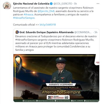 El Ejército Nacional, desde su cuenta de Twitter, lamentó el asesinato del sargento. “Lamentamos el vil asesinato de nuestro sargento viceprimero Robinson Rodríguez Murillo, asesinado durante su servicio a la patria en Arauca. Acompañamos a familiares y amigos de nuestro #HéroePorSiempre”, escribieron.