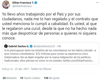 La crítica del representante Santos no pasó desapercibida por Dilian Francisca Toro, quien le contestó por medio de Twitter, señalando que, supuestamente, le regalaron la curul que ocupa en la Cámara de Representantes y cuestionando su labor como legislador.