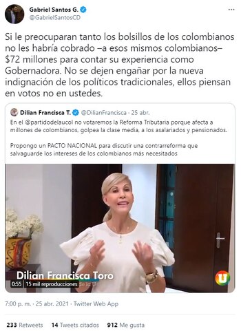 Santos reiteró posteriormente su crítica a Toro señalando que ella aparenta estar cercana a la gente con la oposición a la reforma tributaria. La exgobernadora del Valle ha sonado como posible candidata presidencial de La U.