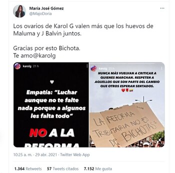 “Empatía: “Luchas aunque no te falta nada, porque a algunos les falta todo” NO A LA REFORMA TRIBUTARIA”, posteó en sus redes la cotizada cantante. Mientras que en otra historia puso una foto de una joven con un cartel que decía: “La reforma tributaria no es de Bichotas”, y Karol dijo: “Nunca más vuelvan a criticar a quienes marchan. Respeten a aquellos que son parte del cambio que otros esperan sentados”.