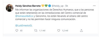 Por su parte, la concejala Heidy Sánchez Barreto trinó: “Me informan las organizaciones de Derechos Humanos, que a las personas que están reteniendo en las inmediaciones del Centro comercial de Tomás y Jerónimo, los están llevando al sótano del centro comercial y no les permiten hacer ninguna comunicación”.