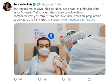 Después de recibir la vacuna el ministro no evitó expresar su felicidad por medio de su cuenta de Twitter donde escribió: “Ese sentimiento de alivio, algo de rubor, más una íntima reflexión sobre estos 14 meses. Y el agradecimiento a tantos colombianos, compañeros/amigos, mujer e hija que incontables veces me preguntaron sobre cuándo lo haría. Gracias a todos!”.