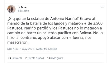 En Twitter varios pastusos explican el por qué entre algunos ciudadanos de esa región no es bien visto Antonio Nariño. “¿Por qué quitar la estatua de Antonio Nariño? Estuvo al mando de la batalla de los Ejidos y mataron más de 3.500 pastusos. Nariño perdió y los pastusos no lo mataron a cambio de hacer un acuerdo pacífico con Bolívar. No lo hizo, al contrario, apoyó atacar con más fuerza, nos masacraron”.