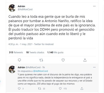 “Cuando leo a toda esa gente que se burla de mis paisanos por tumbar a Antonio Nariño, ratificó la idea de que el mayor problema de este país es la ignorancia. Él pudo traducir los DDHH pero promovió el genocidio del pueblo pastuso aún cuando este lo liberó y le perdonó la vida”, contó otro usuario.