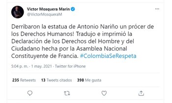 Por otro lado, hay quienes creen que la estatua merecía estar en el lugar. “Derribaron la estatua de Antonio Nariño un prócer de los Derechos Humanos! Tradujo e imprimió la Declaración de los Derechos del Hombre y del Ciudadano hecha por la Asamblea Nacional Constituyente de Francia”, dijo el abogado, Victor Mosquera Marin.