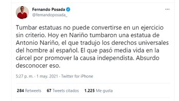 Mientras que el politólogo Fernando Posada, aseguró que, “tumbar estatuas no puede convertirse en un ejercicio sin criterio. Hoy en Nariño tumbaron una estatua de Antonio Nariño, el que tradujo los derechos universales del hombre al español. El que pasó media vida en la cárcel por promover la causa independista. Absurdo desconocer eso”.