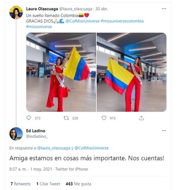 Por la pandemia no hubo despedida especial para la candidata colombiana por lo que en las redes sociales se informó de la partida de la cartagenera. En su cuenta de Twitter la reina publicó: “Un sueño llamado Colombia, GRACIAS DIOS”. Trino que no encajó muy bien en el contexto en el que se da pues este 1 de mayo se dio una nueva jornada de manifestaciones en las principales ciudades del país en contra de la reforma tributaria.