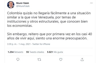 “Colombia quizás no llegaría fácilmente a una situación similar a la que vive Venezuela, por temas de instituciones y otros estructurales, que conocen bien los economistas. Sin embargo, reitero que por primera vez en los casi 40 años de vivir aquí, siento una enorme preocupación”, escribió el CEO.