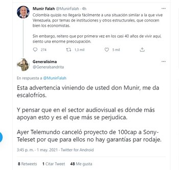 “Esta advertencia viniendo de usted don Munir, me da escalofríos. Y pensar que en el sector audiovisual es dónde más apoyan esto y es el que más se perjudica. Ayer, Telemundo canceló proyecto de 100 capítulos a Sony-Teleset por que para ellos no hay garantías para rodaje”, dijo alguien más.