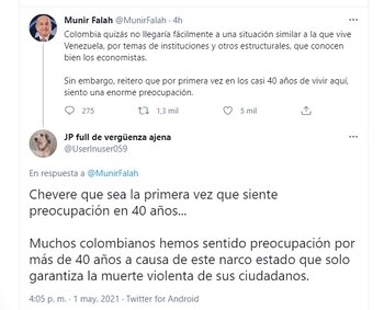 “Es la consecuencia de décadas de ser gobernados por los mismos. Es la respuesta de un pueblo harto de ser robado, engañado y manipulado por un Estado corrompido, mezquino, ruin y uribista”, fue otro de los comentarios.
