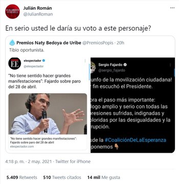Esos dos pronunciamientos fueron contrapuestos para, como han hecho los contradictores políticos de Fajardo, llamarlo nuevamente “tibio”. La publicación se hizo viral rápidamente como más de 4.000 retweets y 9.000 me gusta.