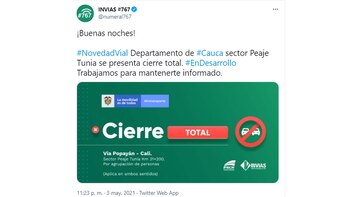 En cuanto al departamento del Valle del Cauca, Invias reporta cierre de la vía Popayán con la ciudad de Cali, en el sector Peaje Tunia el cual presenta cierre total.