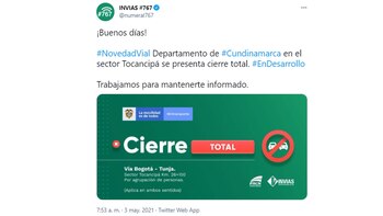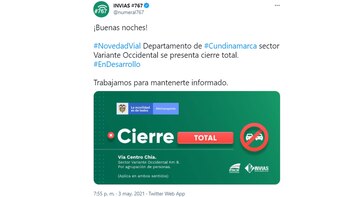 Asimismo, en la vía que conduce de Bogotá al municipio aledaño de Chía. De acuerdo con el Twitter de Invias, a la altura del sector Variante Occidental se presenta cierre total.