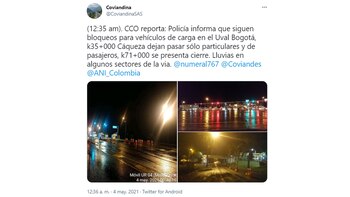 De otra parte, la Autopista Bogotá - Medellín que llevaba más de 20 horas bloqueada a la altura del municipio de El Rosal, Cundinamarca, hace poco fue habilitada. Asi mismo la vía que conduce de Bogotá al municipio La Vega, tambien se reportó su apertura.