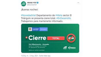 De acuerdo con el Programa de Seguridad en Carreteras Nacionales del INVIAS, desde su cuenta de Twitter, ha reportado el cierre de la vía que conducede de Villavicencio al municipio de Granada en el departamento del Meta, en la altura del sector El Triángulo kilometro 12.
