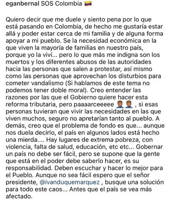 Además, Bernal señaló que entiende las necesidades económicas que vive Colombia, porque él mismo las vivió y manifestó que le indignan los muertos y los distintos abusos de la fuerza pública que han inundado las redes sociales en los últimos siete días de manifestaciones.