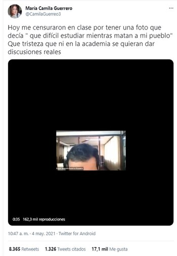 “Hoy me censuraron en clase por tener una foto que decía “qué difícil estudiar mientras matan a mi pueblo”. Qué tristeza que ni en la academia se quieran dar discusiones reales”, escribió Guerrero en la publicación de su denuncia.