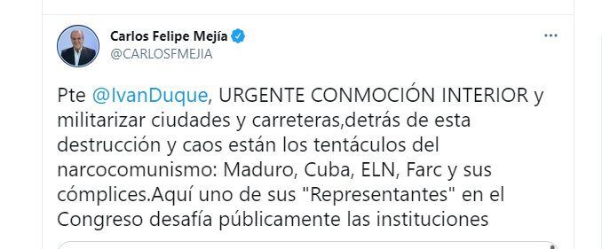 “Presidente Duque, URGENTE CONMOCIÓN INTERIOR y militarizar ciudades y carreteras, detrás de esta destrucción y caos están los tentáculos del narcocomunismo: Maduro, Cuba, ELN, Farc y sus cómplices”, trinó el senador Carlos Felipe Mejía.
