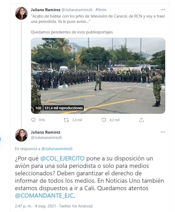 El video lo reveló la periodista Juliana Ramírez, quien cuestionó que la invitación del Ejército sea solo para algunos medios de comunicación. “¿Por qué el Ejército pone a su disposición un avión para una sola periodista o solo para medios seleccionados? Deben garantizar el derecho de informar de todos los medios”, se preguntó la comunicadora.